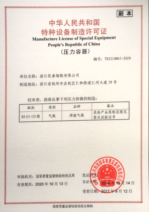 经过充分的准备和严格的测试,民泰钢瓶顺利地完成了国家专业机构评审,获得了消防气瓶的特种设备生产许可证。民泰钢瓶稳扎稳打,不断提升自身技术和生产实力,努力为国家经济建设做出更多贡献。